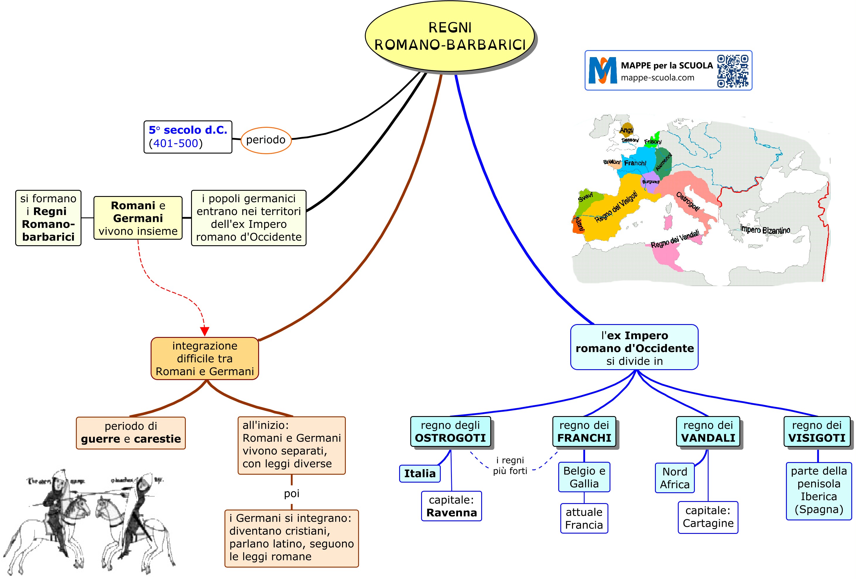 Mappa concettuale sui REGNI ROMANO - BARBARICI.Nel V secolo la parte occidentale dell'ex Impero romano d'Occidente era divisa in:- Regno degli Ostrogoti (con il Re Teodorico), - Regno dei Franchi,- Regno dei Vandali,- Regno dei Visigoti.