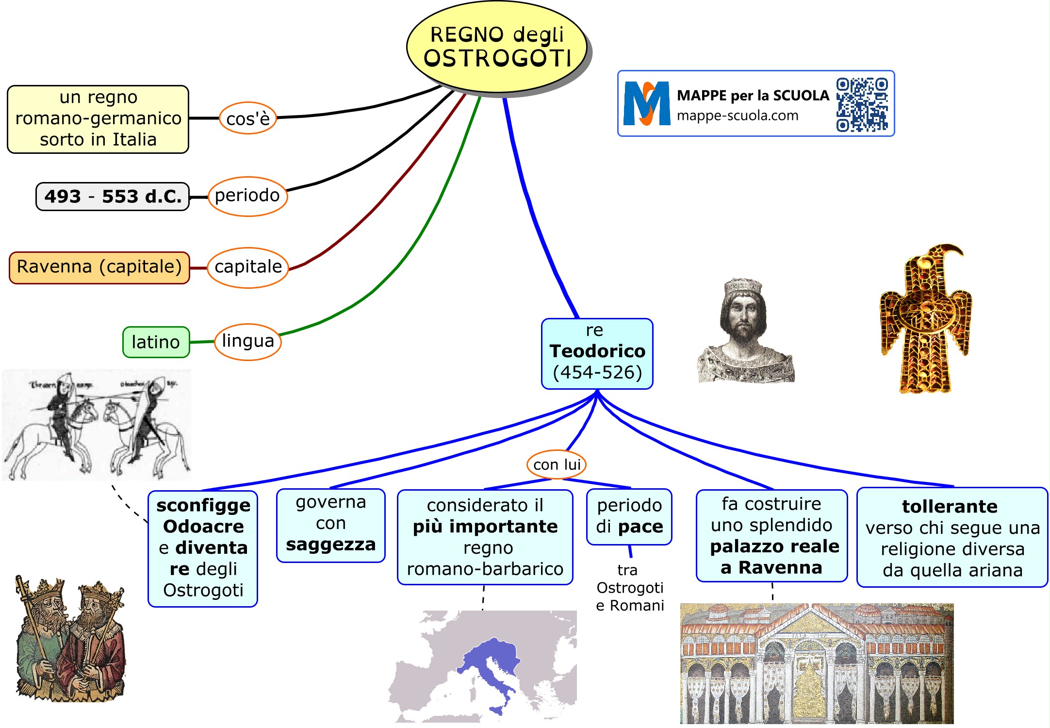 Mappa concettuale sul Regno degli Ostrogoti e re Teodorico. Con re Teodorico, il Regno degli Ostrogoti (regni romano-barbarici), ebbe il periodo di massimo splendore. La capitale del regno era Ravenna...