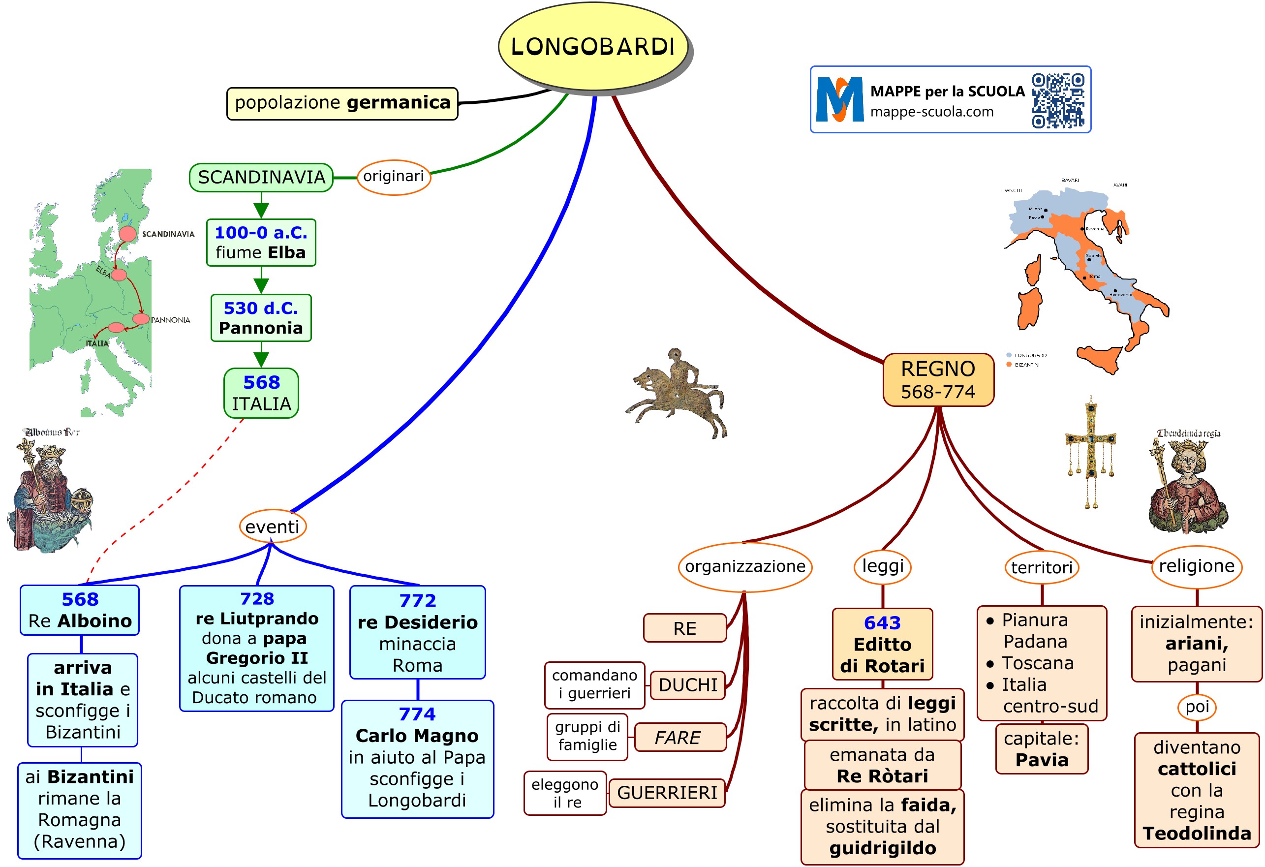 Mappa concettuale su i LONGOBARDI (Storia, scuola secondaria). Nello schgema qui sotto: la migrazione dei Longobardi dalla Scandinavia all'Italia; Re Alboino, l'Editto di Rotari... La regina Teodolinda e la conversione al cattolicesimo...