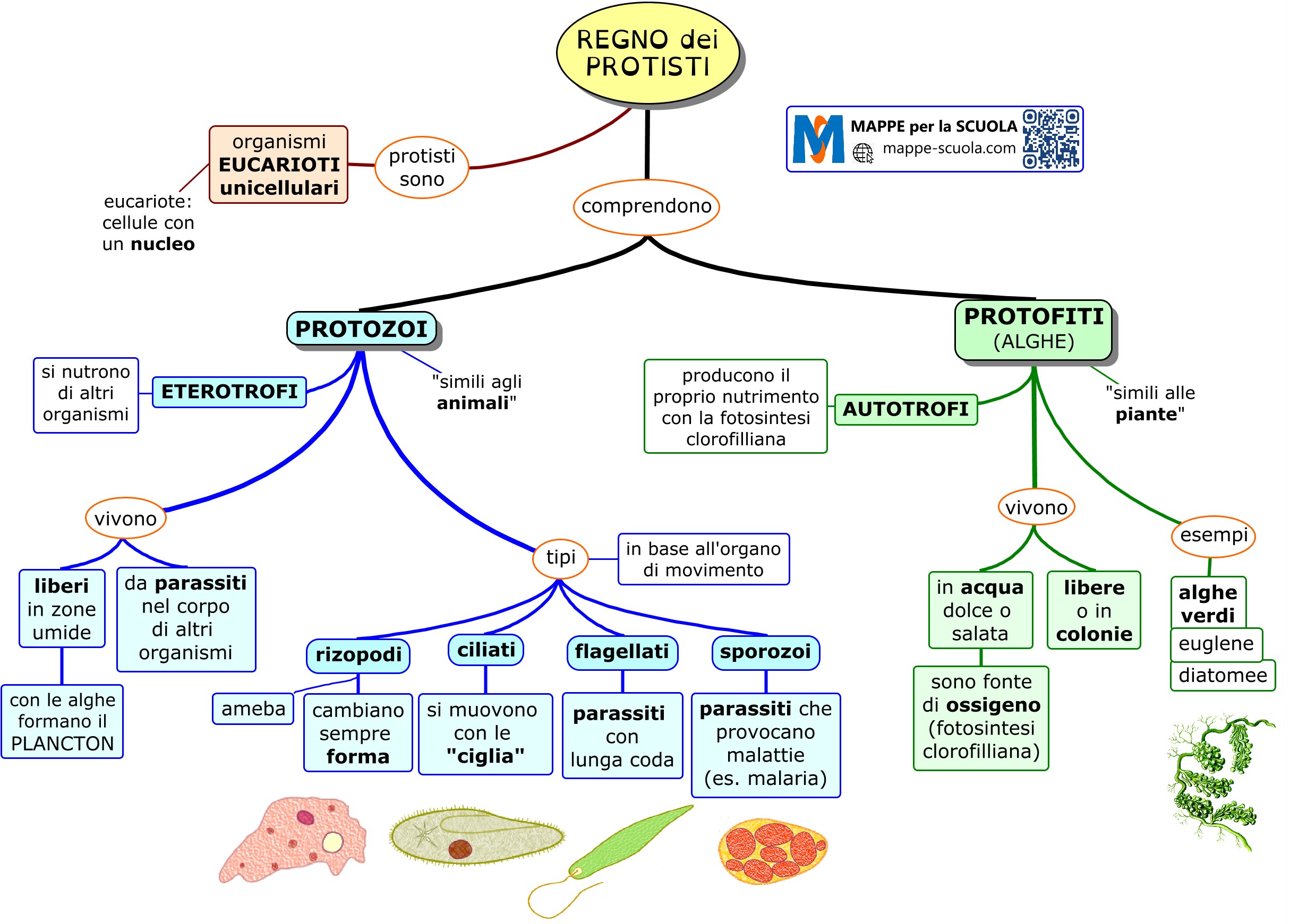 Mappa concettuale sul REGNO DEI PROTISTI (uno dei cinque regni della natura).I protisti sono microrganismi eucarioti con una sola cellula ma molto più complessa e grande rispetto alla cellula procariote (monere).Il regno dei protisti comprende i protozoi e i protofiti (alghe).
