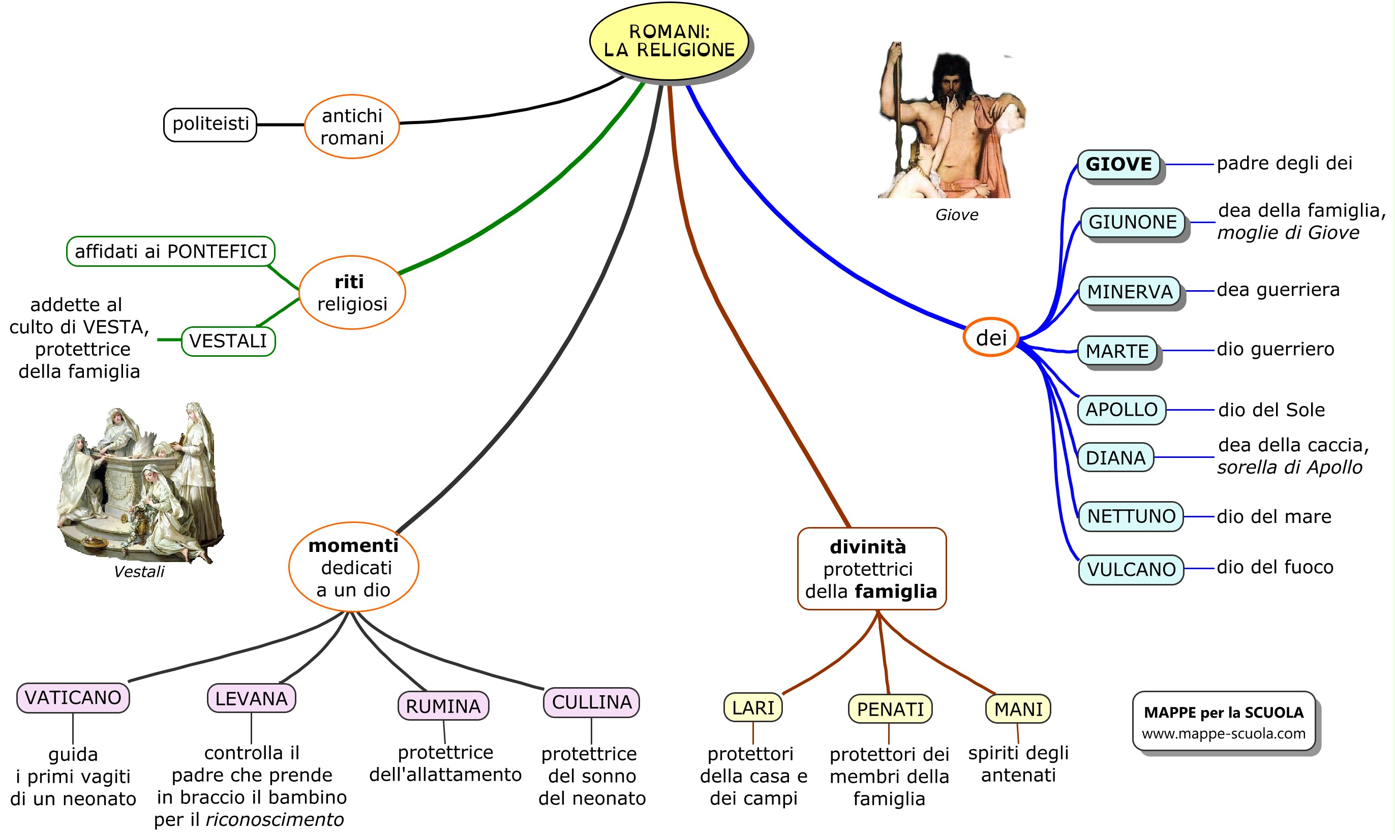 Mappa concettuale sulla RELIGIONE e gliI DEI nell'Antica Roma.Il ruolo delle vestali, i riti, gli dei romani (Giove, Giunone, Minerva, Marte, ecc.)...