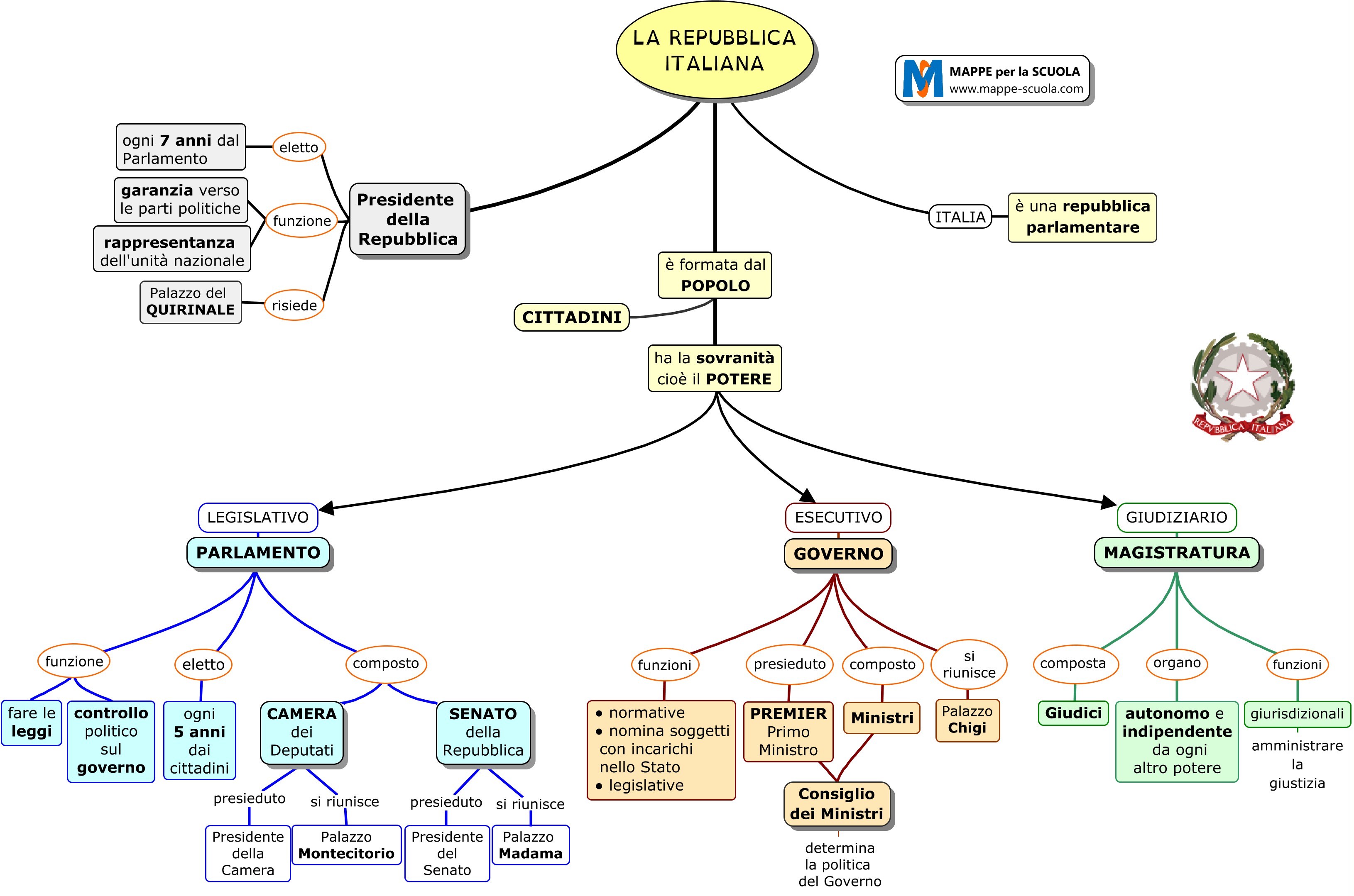 La Repubblica italiana è formata dal popolo (cittadini) che ha la sovranità (potere legislativo, esecutivo e giudiziario). Nella mappa il ruolo del Presidente della Repubblica, la Camera e il Senato, il Consigli dei Ministri, i giudici...