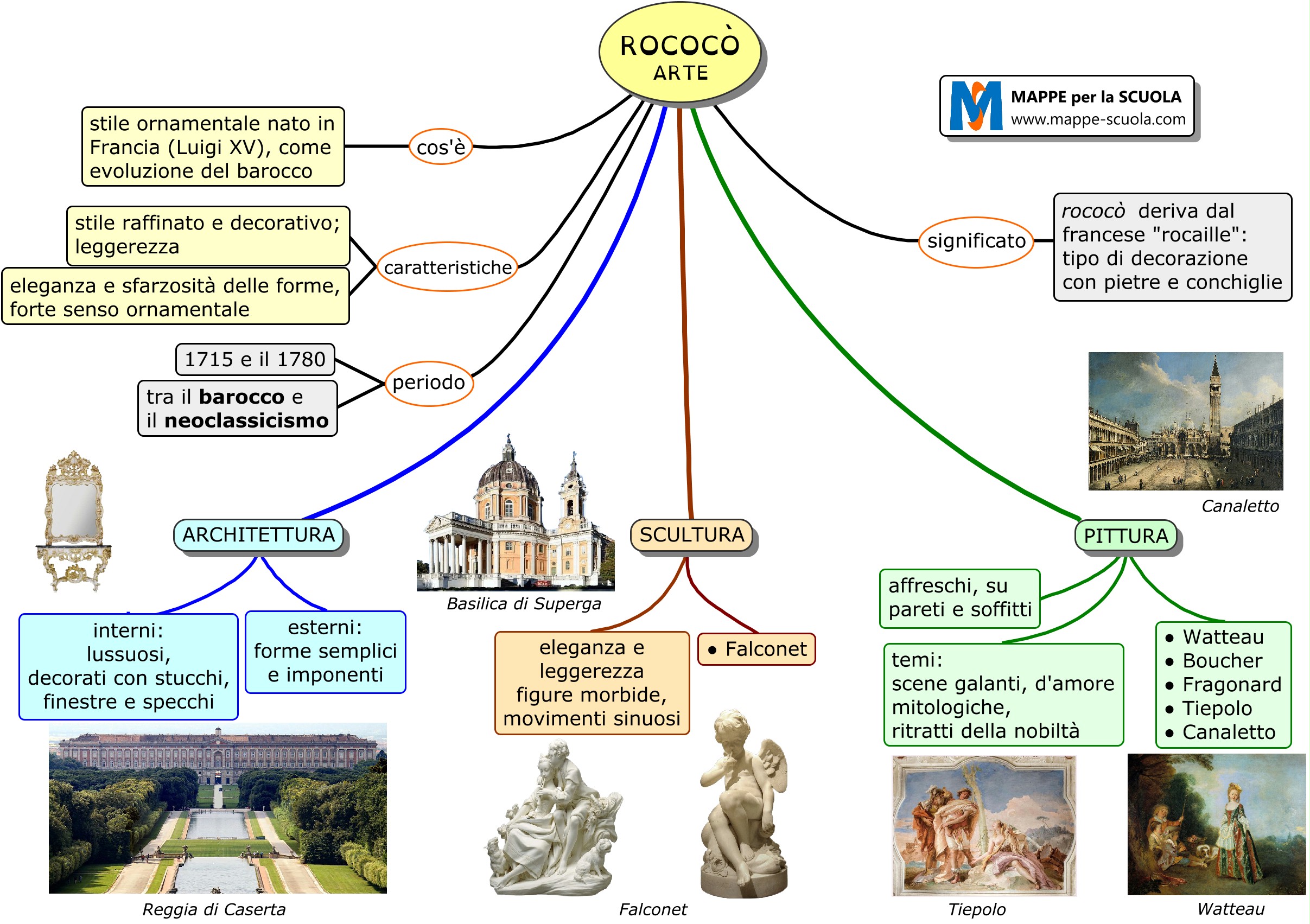 Mappa concettuale sul Rococò (arte). Il Rococò è uno stile artistico e architettonico nato in Francia nel XVIII secolo, come evoluzione del tardo barocco, e precedente il neoclassicismo. Il rococò è caratterizzato da eleganza, raffinatezza e un forte senso decorativo. Nella pittura rococò, predominano scene galanti, mitologiche e ritratti della nobiltà, con artisti come Watteau, Boucher e Fragonard. Anche l'architettura rococò e gli interni riflettono questo gusto per il lusso, con l'uso di stucchi, specchi e decorazioni sontuose.