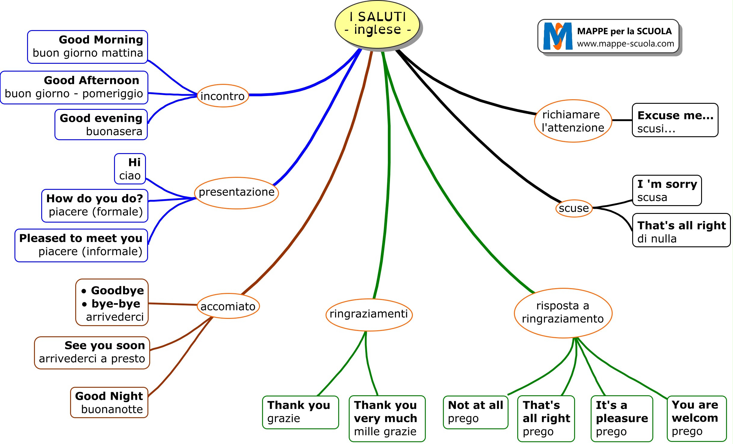 Mappa concettuale sui SALUTI nella lingua INGLESE (scuola media).Good Morning, Good Afternoon, Good evening, Goodbye/ bye-bye, Good Nigh...