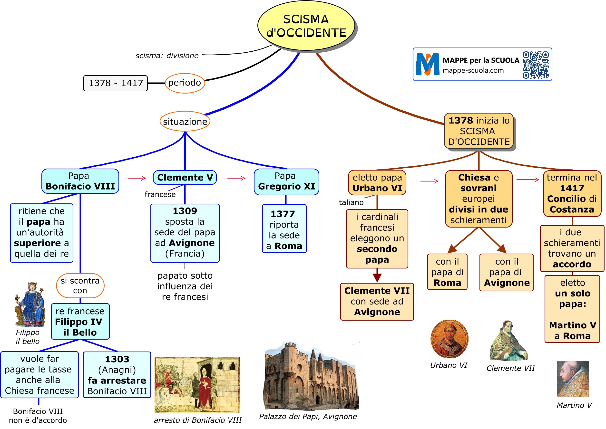 Mappa concettuale sullo SCISMA D'OCCIDENTE. In Europa, nel 1378, iniziò nella Chiesa cristiana lo Scisma d'Occidente: la conseguenza fu la presenza contemporanea di due papi: uno a Roma (Italia) e uno ad Avignone (Francia). Lo scisma si concluse nel 1417 con il Concilio di Costanza.