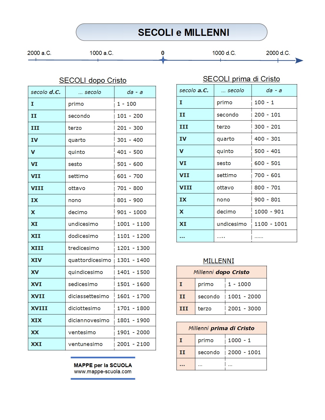 Tabella con i numeri romani ed i relativi secoli e millenni.