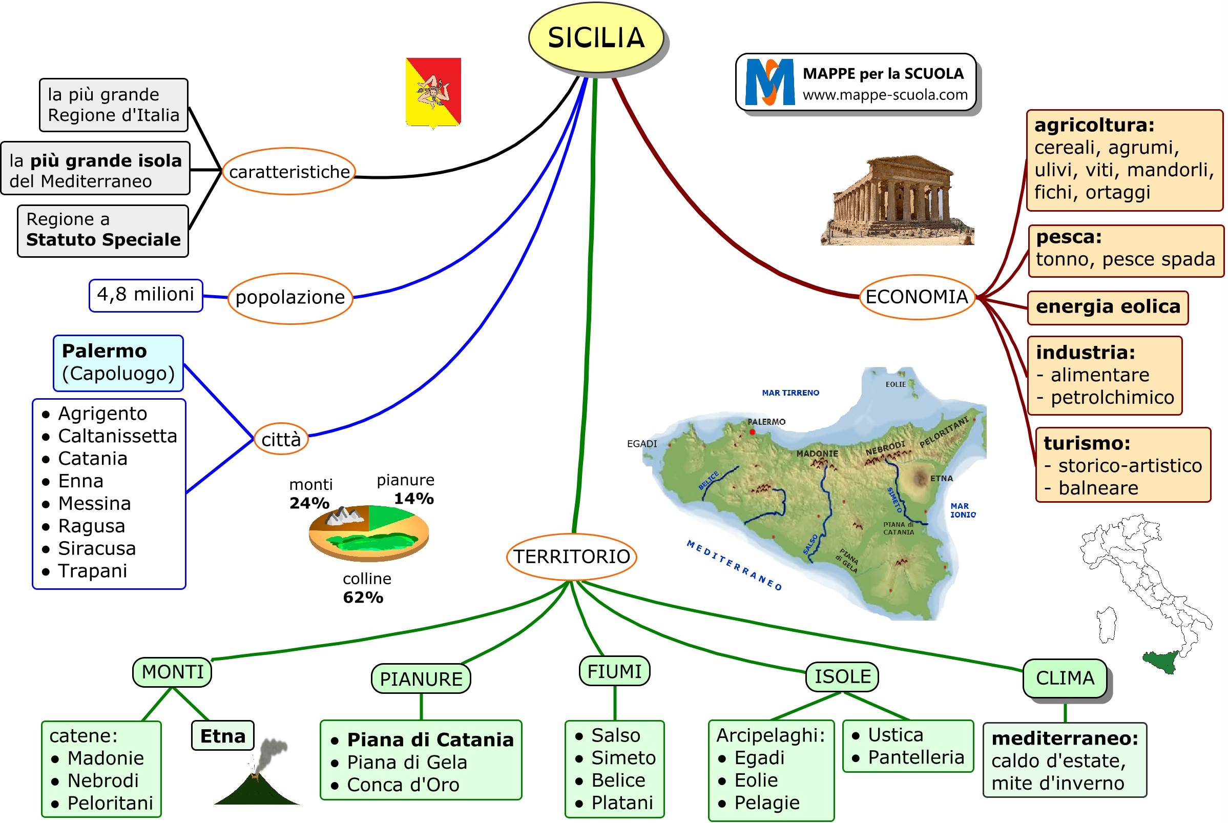 Mappa concettuale sulla SICILIA (geografia, elementari).La Sicilia è la più grande isola del Mediterraneo; lo Stretto di Messina separa la Sicilia dalla Calabria. La Sicilia è una regione d'Italia a Statuto speciale...,