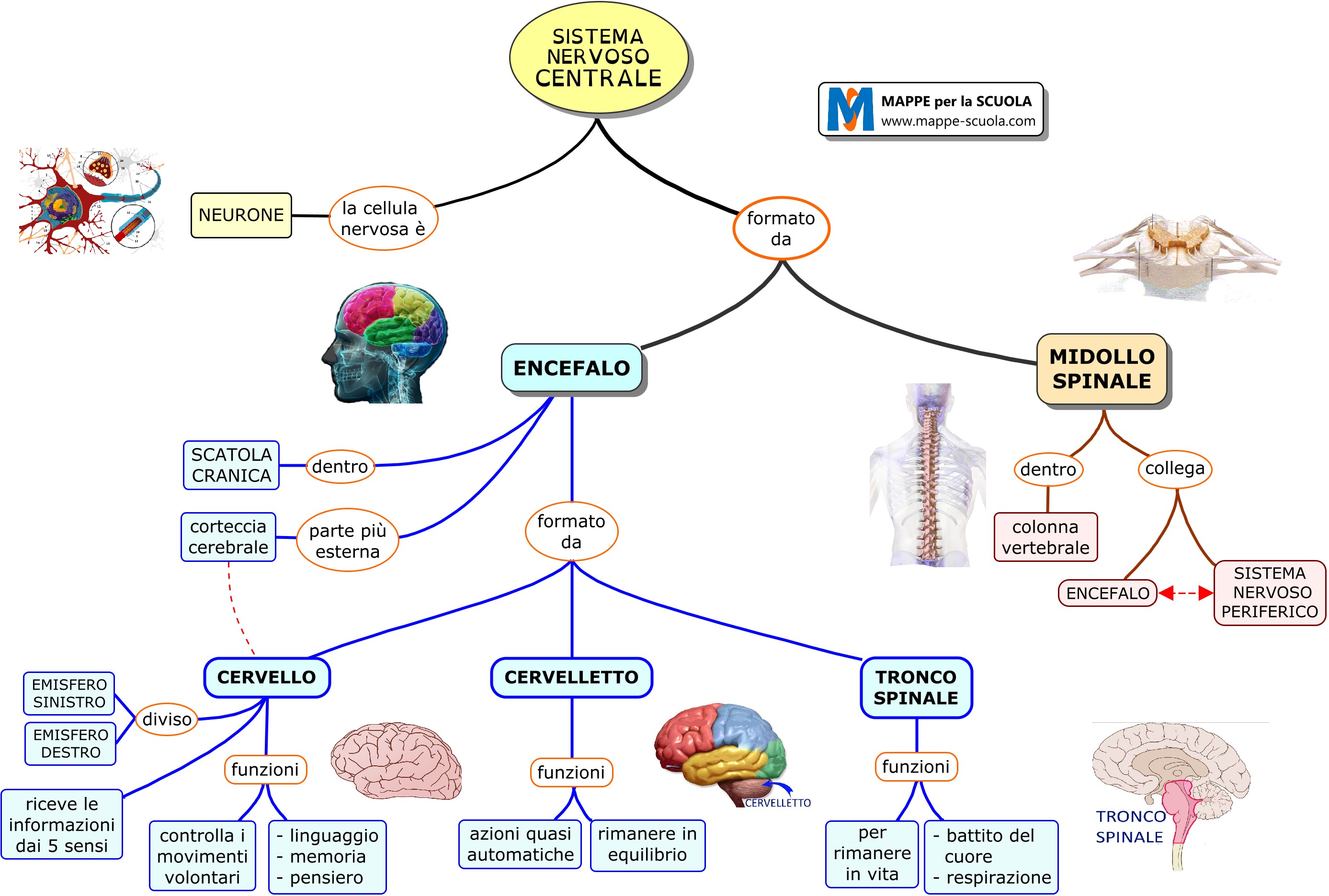 Mappa concettuale sul SISTEMA NERVOSO CENTRALE.Il Sistema Nervoso Centrale insieme al Sistema Nervoso Periferico formano il SISTEMA NERVOSO.La cellula del sistema nervoso è il neurone.