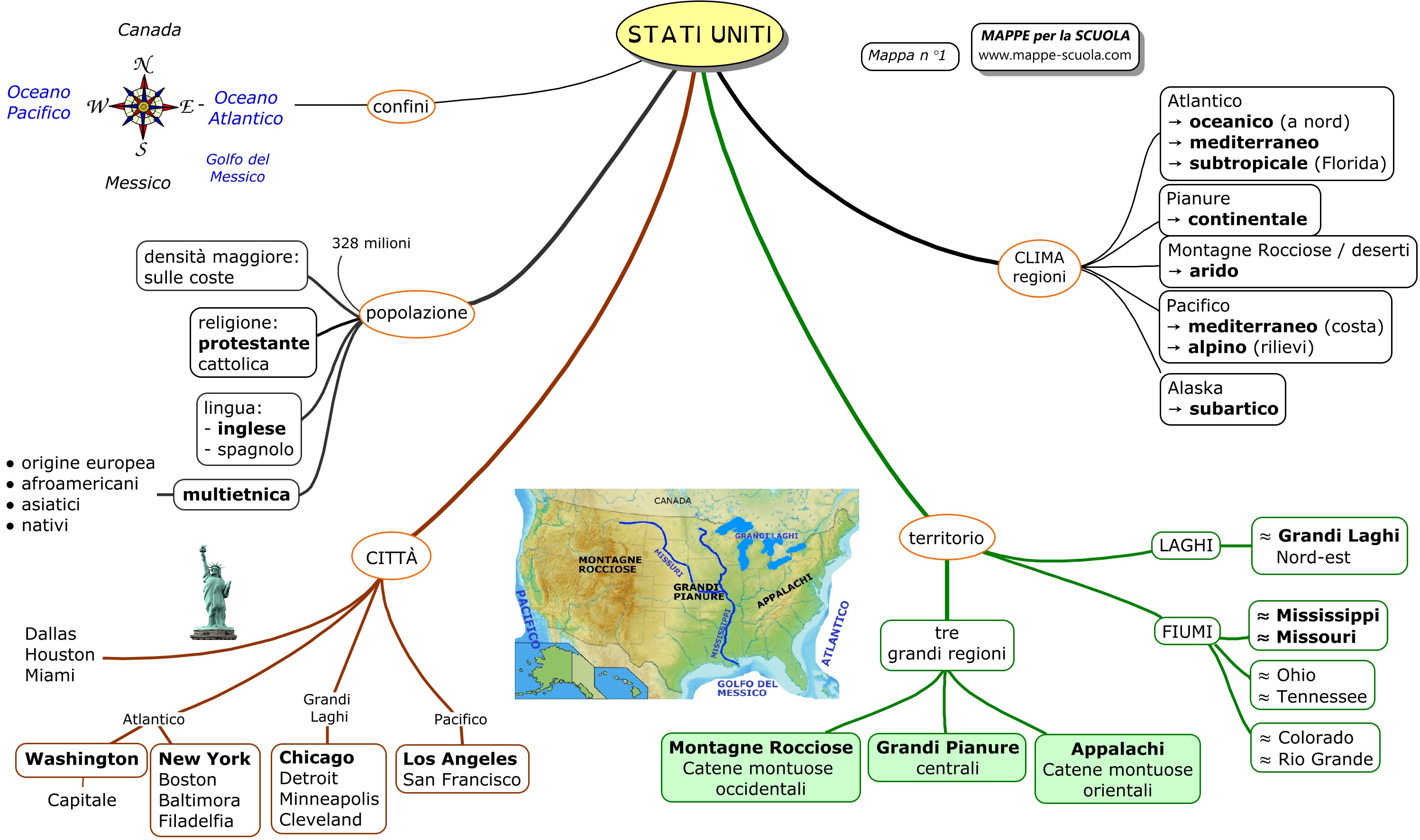 Mappa concettuale sugli STATI UNITI D'AMERICA.Gli Stati Uniti e i suoi confini, la popolazione multietnica, le principali città, i fiumi (Mississippi, Missouri) e il clima.