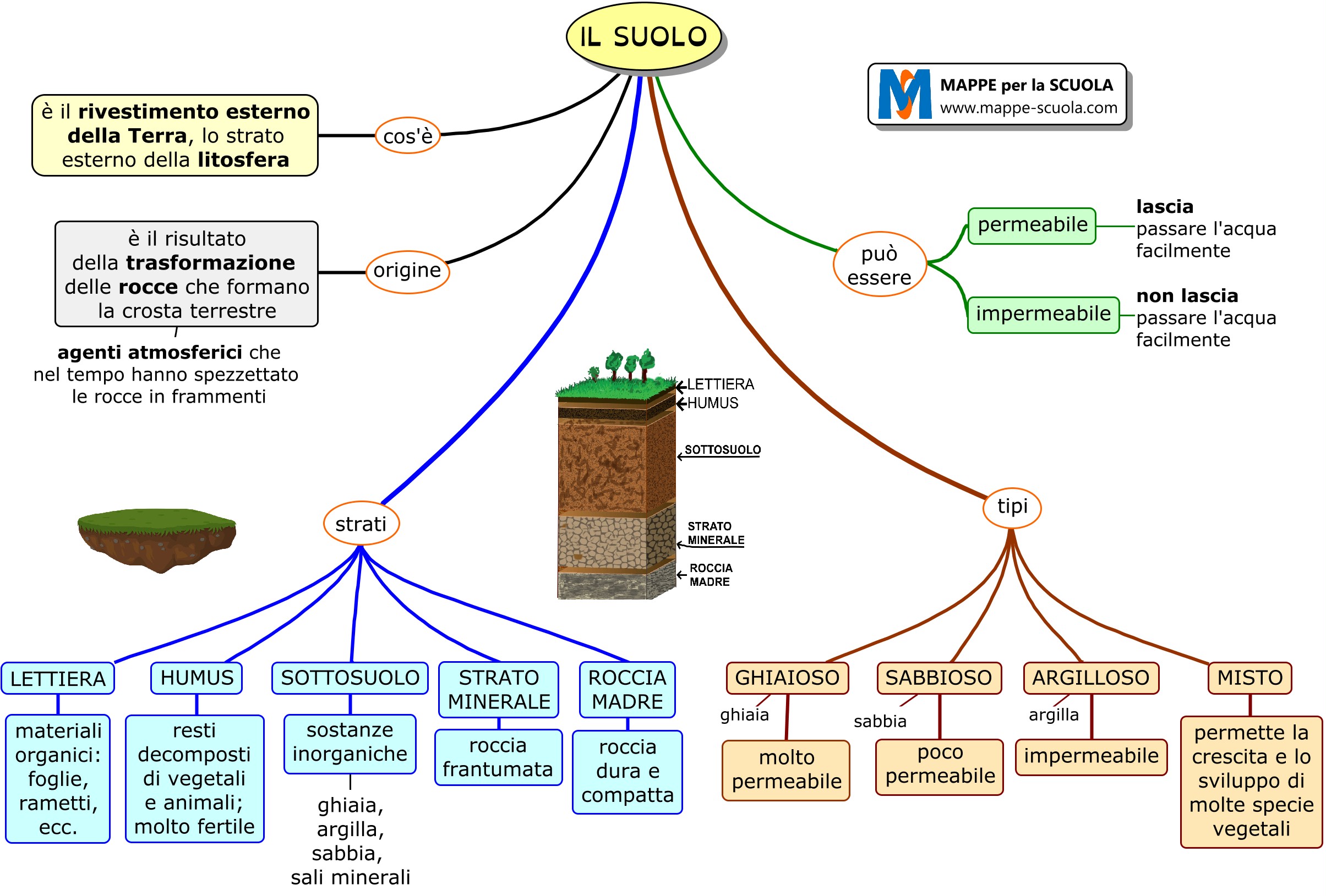 Mappa concettuale sul SUOLO, la parte superficiale della Terra (scienze, scuola secondaria).