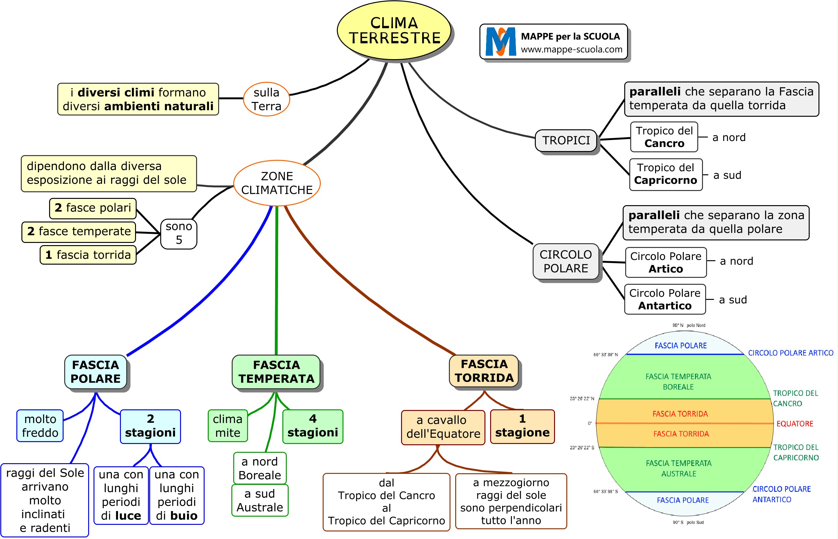 Mappa concettuale sul CLIMA SUL PIANETA TERRA (scienze, geografia).I diversi climi formano sulla Terra diversi ambienti naturali.Nella mappa vengono esposte le fasce polari, le fasce temperate e la fascia torrida.