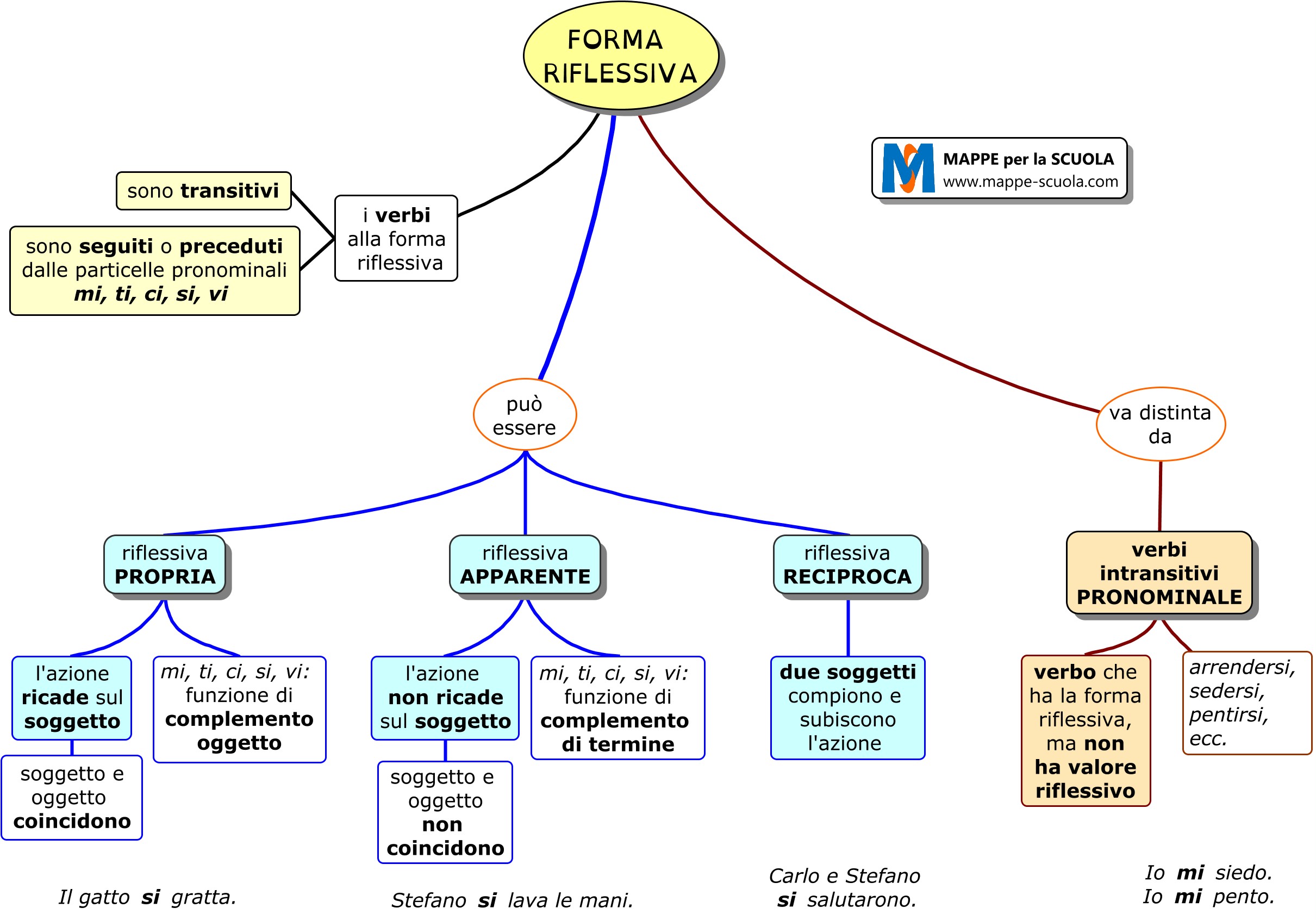 Mappa concettuale sulla FORMA RIFLESSIVA DEL VERBO.Riflessivo proprio, riflessivo apparente, riflessivo reciproco;verbi intransitivi pronominali.