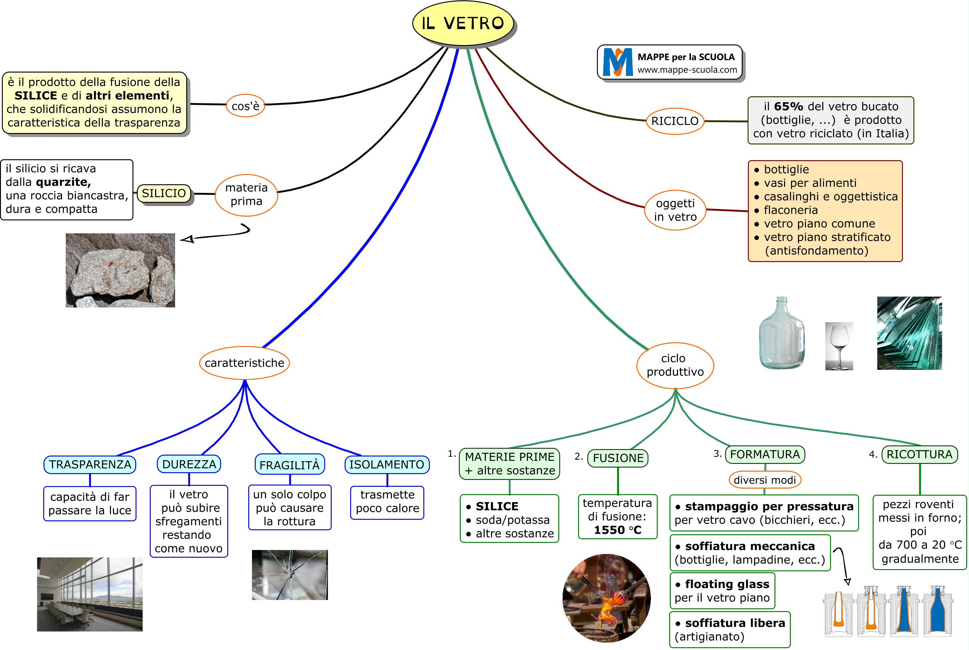 Mappa concettuale sul VETRO (tecnologia, scuola secondaria). Nello schema qui sotto: la materia prima del vetro (silice), le proprietà e la lavorazione.