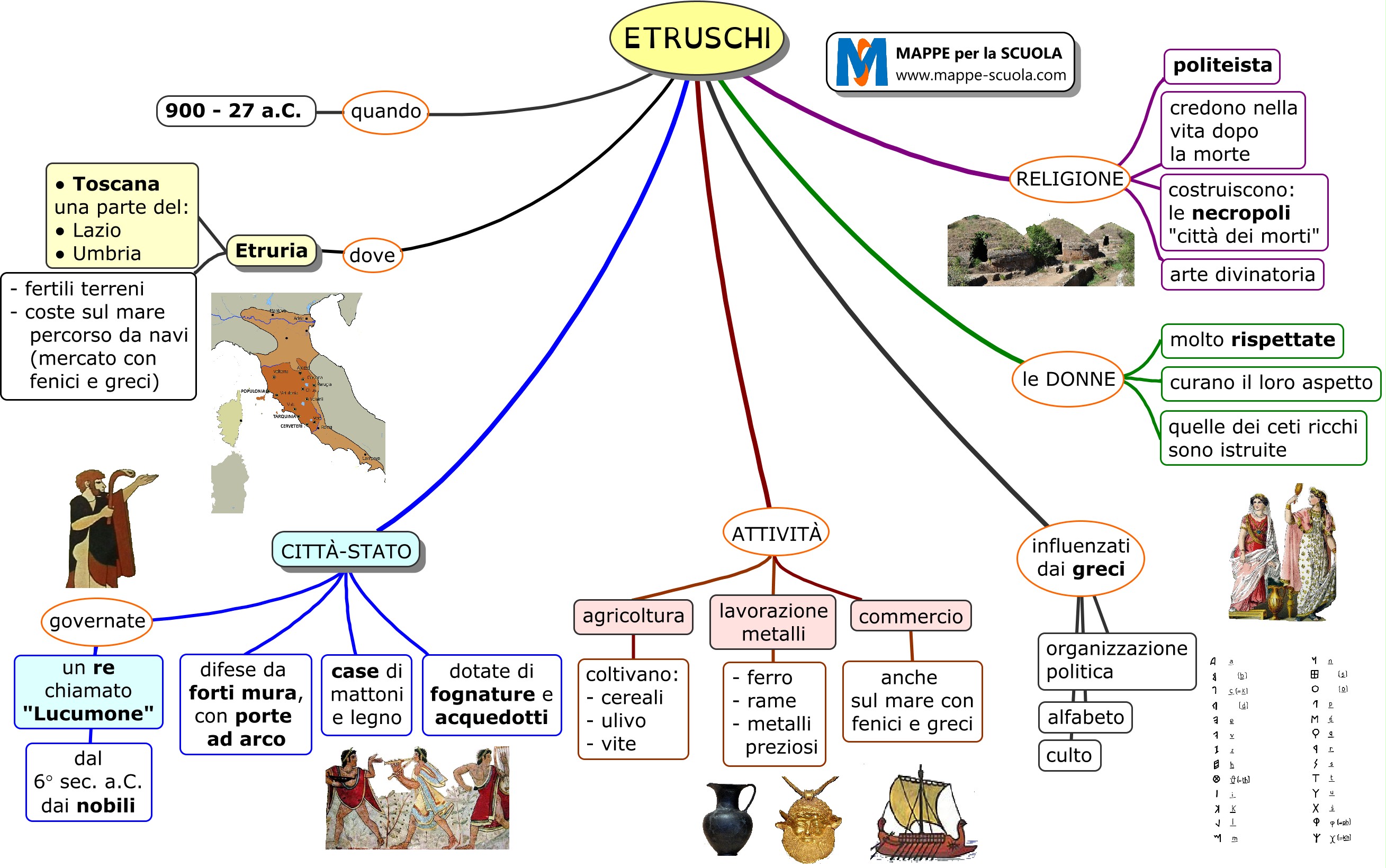 Sintesi sulla storia degli etruschi: il re lucumone, le donne etrusche, le città etrusche, le necropoli e la religione etrusca, ecc.